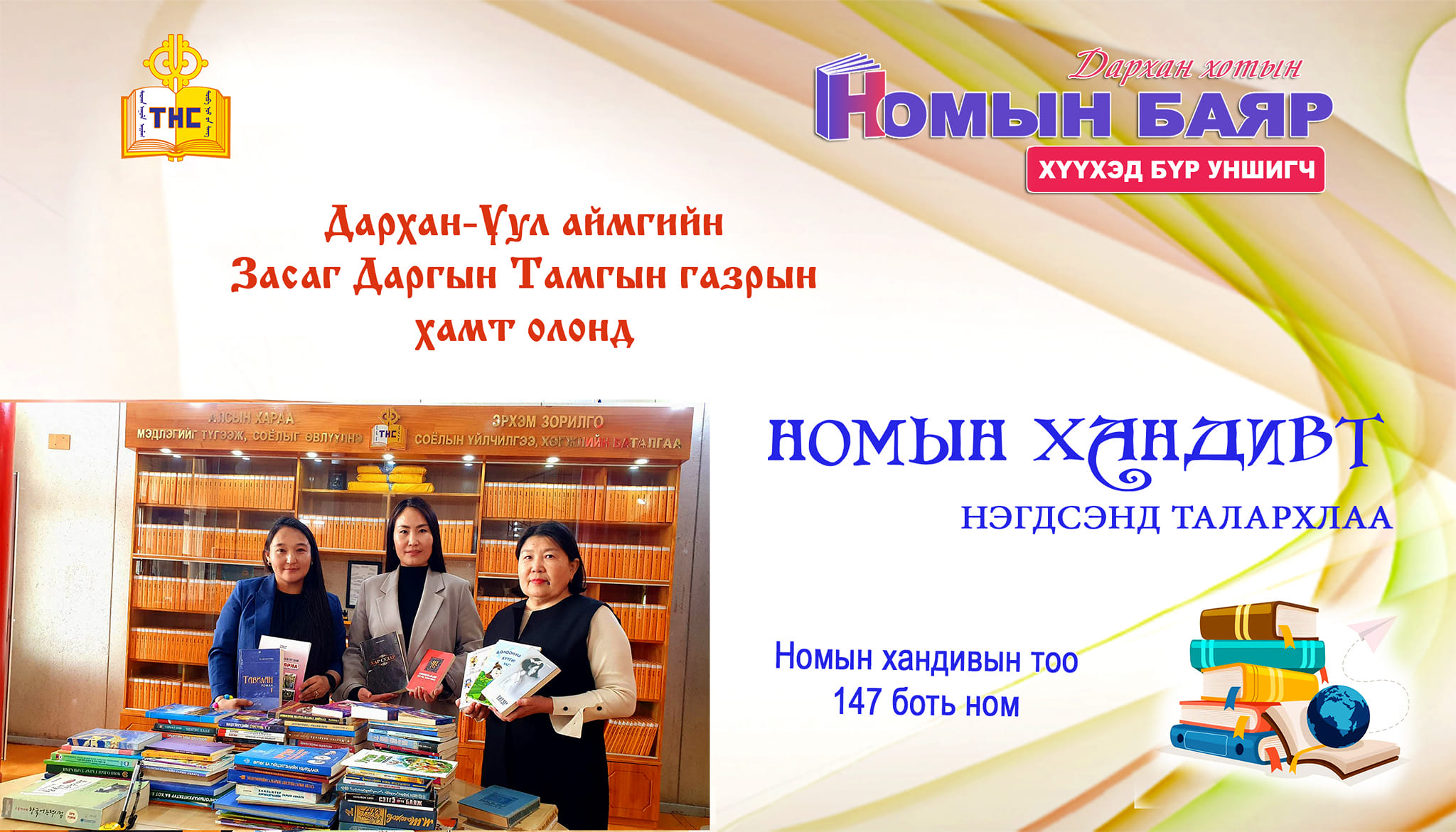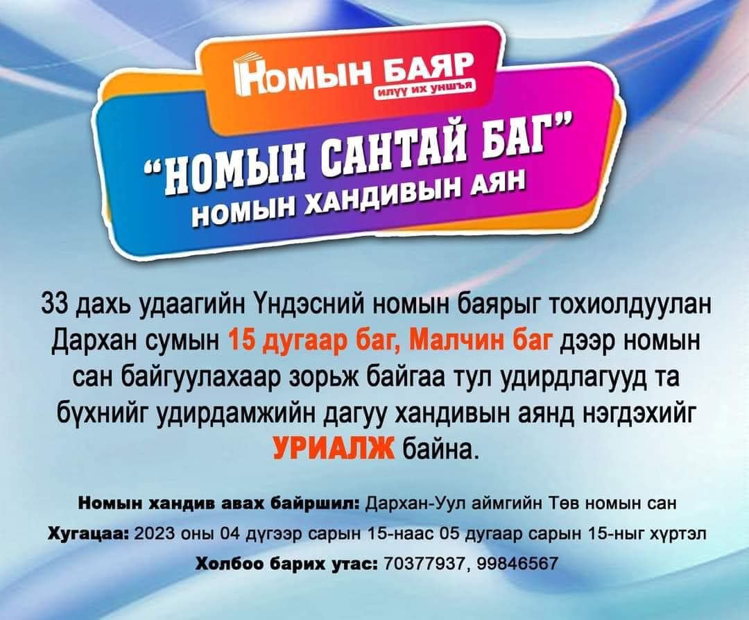 33 дахь удаагийн Үндэсний номын баярыг угтан аймгийн Төв номын сангаас номын баярын хүрээнд алслагдсан багууд болох 15, Малчин багуудад мини номын сан байгуулахаар НОМЫН САНТАЙ БАГ номын хандивын аяныг эхлүүлсэн билээ.